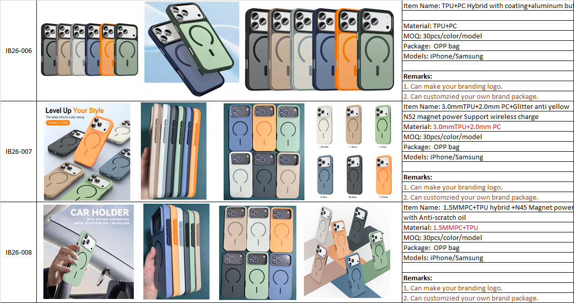 - The Solution (Our Model IB26-006/007/008): We use a Hybrid PC+TPU structure with a specialized "Skin-Feel" Coating. It is anti-fingerprint, anti-scratch, and feels silky smooth. The contrasting buttons and camera rings give it a premium, customized look right out of the box.