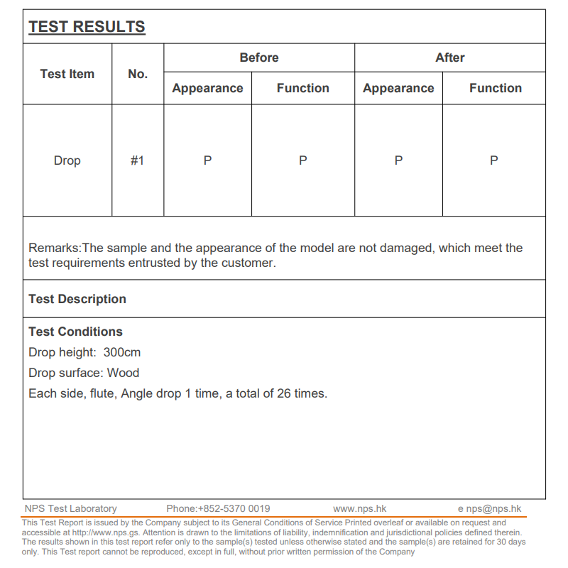 Certified by NPS Test Laboratory: Zero damage after 26 drops from 3 meters height, ensuring the highest quality standards for our global partners.