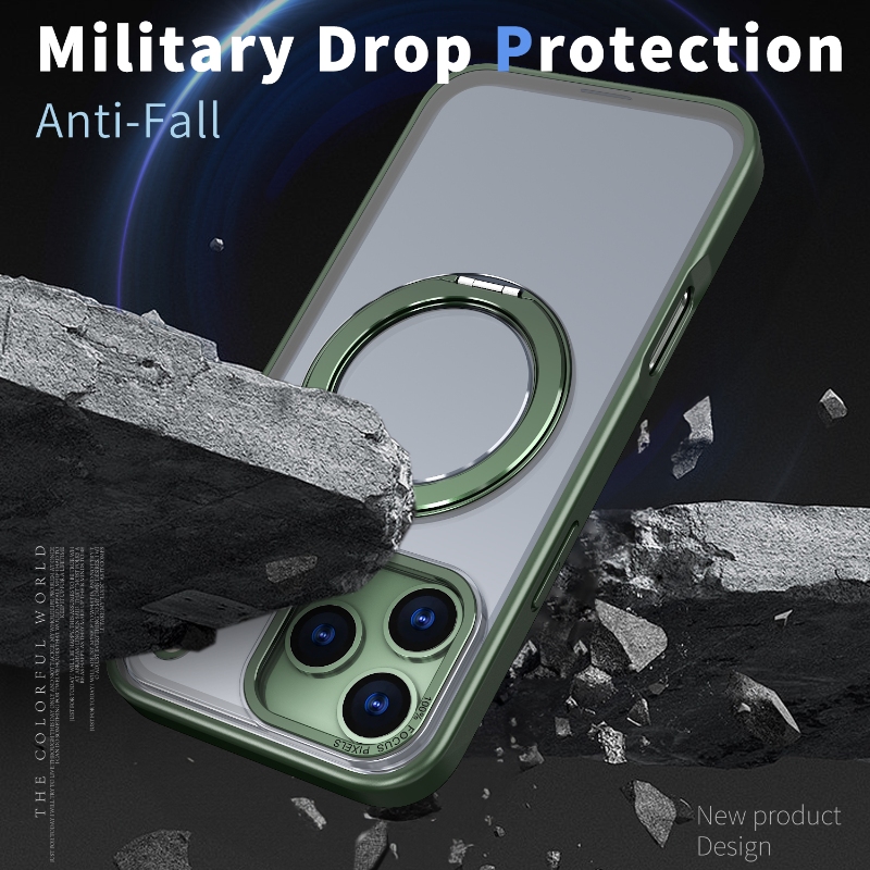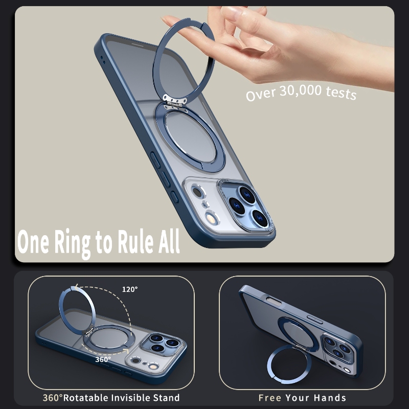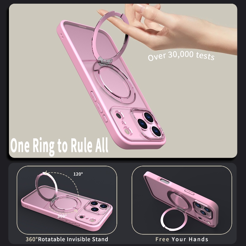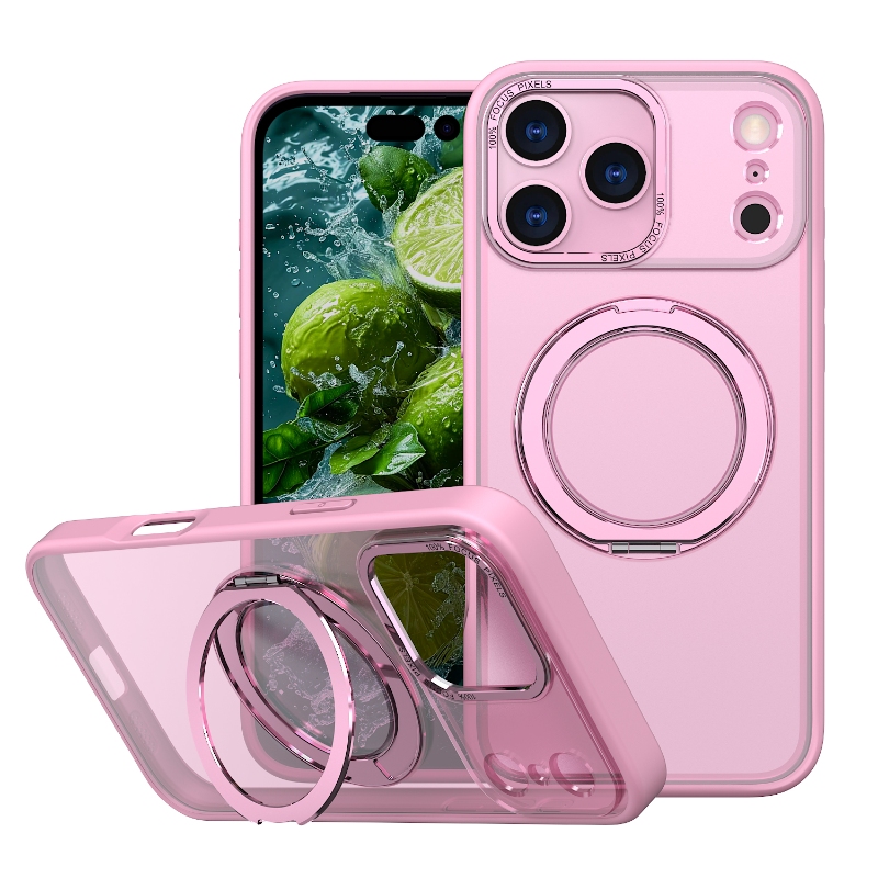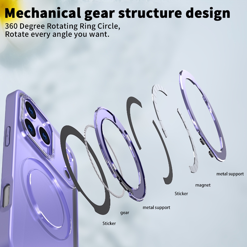 Premium matte case with a 360° rotatable mechanical gear stand (satisfying click sound). Features N52 magnets and metal camera frame. Wholesale for iPhone, Samsung, Moto, Xiaomi, and Google.